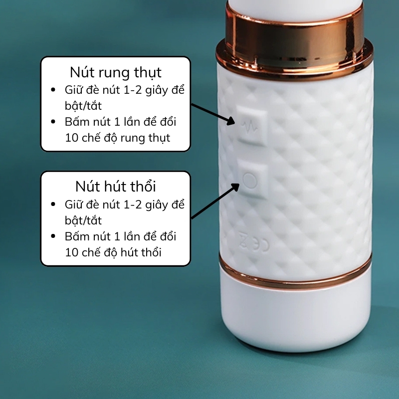 - Phần điều khiển: Có 2 nút riêng biệt để điều khiển dương vật và phần hút